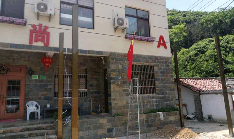 安徽省宣城市云尚山莊,一處快完工的休閑山莊,因考慮到雨天和烈日,在門口加裝遮陽(yáng)雨棚。